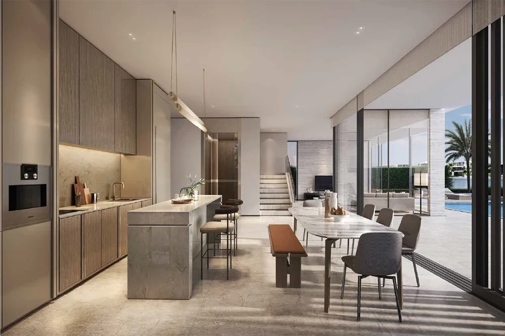 This stunning beach villa with sophisticated facade and it's chic neutral tones that blends into the luxury island lifestyle experience surrounded by natural elements comprises of six bedrooms, eight bathrooms, both chef's kitchen and the prep kitchen as well as staff quarter, extra family room and a spectacular roof lounge and terrace.