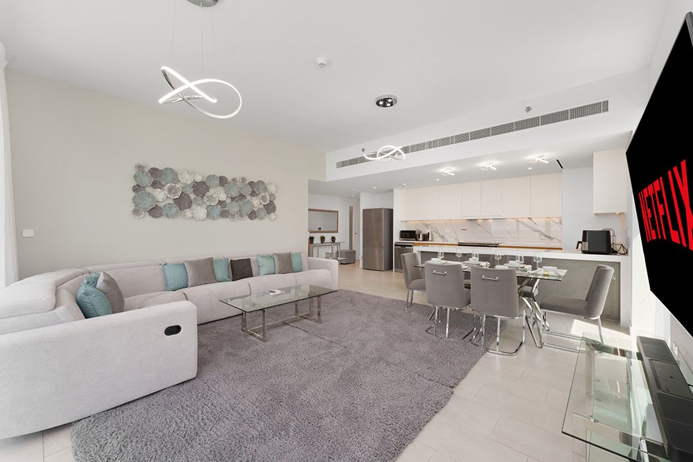 This modern and bright three bedroom apartment comprises of an open plan kitchen with living and dining with seamless access to the terrace embracing the indoor outdoor seafront living feel and its stunning views of the endless Arabian sea. This gorgeous apartment has 2 terraces accessible both from living area and bedrooms.