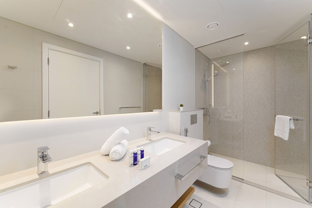 Master bedroom suite comprises of a spacious layout with its own terrace, fitted wardrobes/dressing area in seamless white finishing and well sized ensuite bathroom with his and her's sink as well as walk in rain shower. Apart from having access to terrace windows of all bedrooms have possibility to be slightly opened so you can enjoy the fresh air without the need of air conditioning in the cooler months. Includes also maid's room and separate laundry room.
