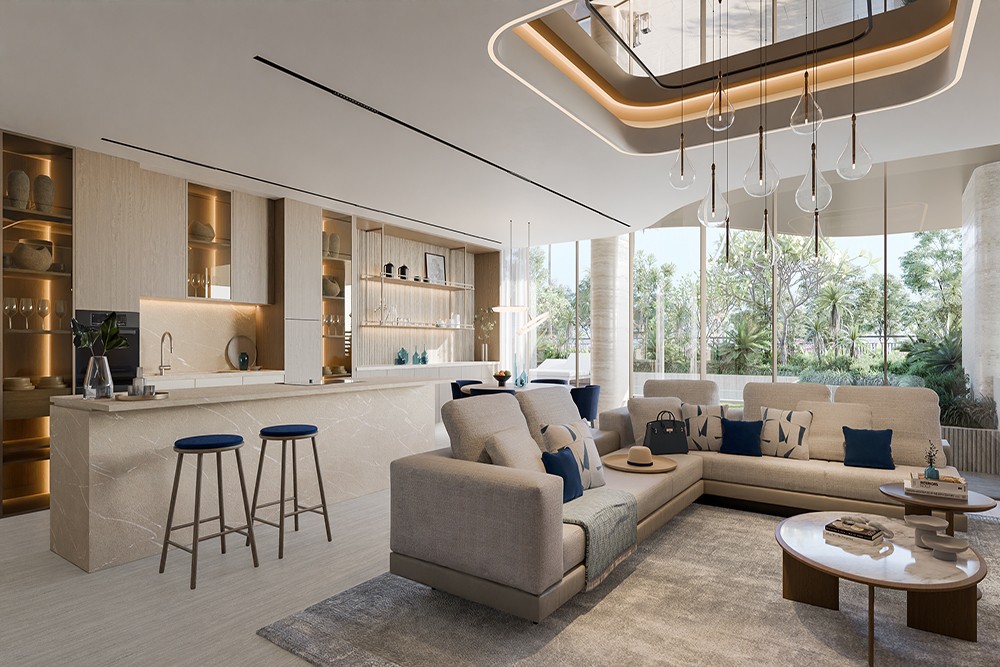 Beautifully designed and fitted with some of the best materials such as Consentino Dekton Marmorio for the flooring throughout the residences, travertine stone wall panelling combined with oak wood with integrated lights, Miele kitchen appliances and Snaidero Kitchen fittings with Laminam Diamond Cream countertops to name a few. For Bathrooms Gessi faucets and hardware with brass finishing and feature free standing bathtub made of top notch travertine in one slab.