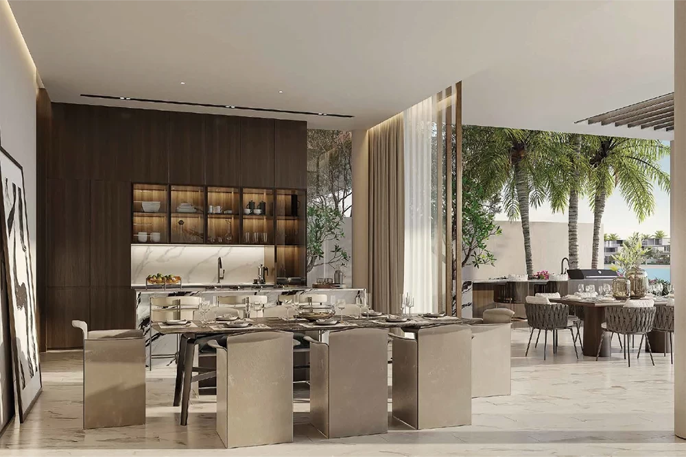 This stunning beach villa with sophisticated facade and it's chic neutral tones that blends into the luxury island lifestyle experience surrounded by natural elements comprises of six bedrooms, eight bathrooms, both chef's kitchen and the prep kitchen as well as staff quarter, extra family room and a spectacular roof lounge and terrace.