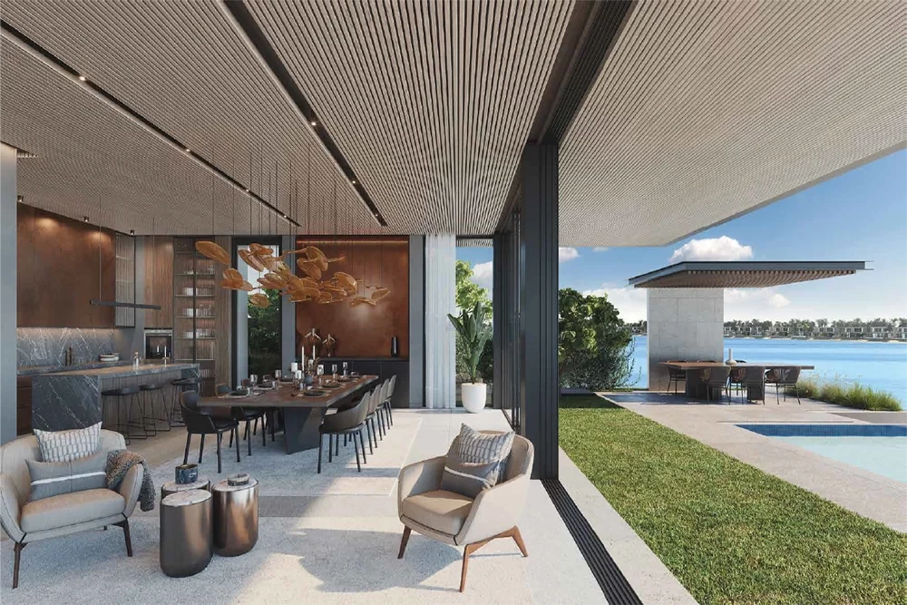 This stunning beach villa with sophisticated facade and it's chic neutral tones that blends into the luxury island lifestyle experience surrounded by natural elements comprises of six bedrooms, eight bathrooms, both chef's kitchen and the prep kitchen as well as staff quarter, extra family room and a spectacular roof lounge and terrace.